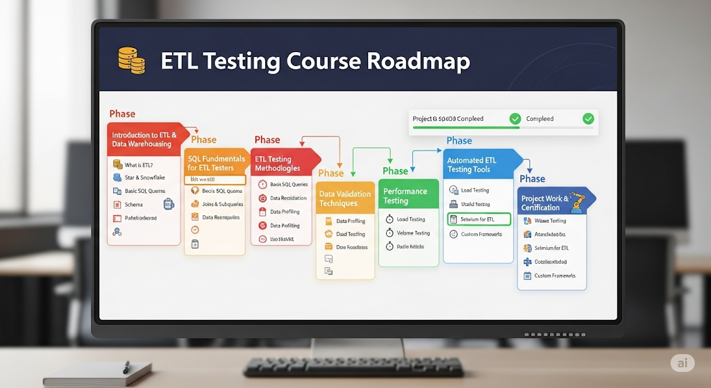 The ETL Testing course is crafted to build expertise in validating data integration, transformation, and loading processes in Data Warehousing environments. Learners will gain proficiency in SQL, ETL tools, data validation, reporting, and real-time scenario testing. Ideal for aspiring Data Testers, QA Engineers, and professionals moving into data-centric testing roles.
