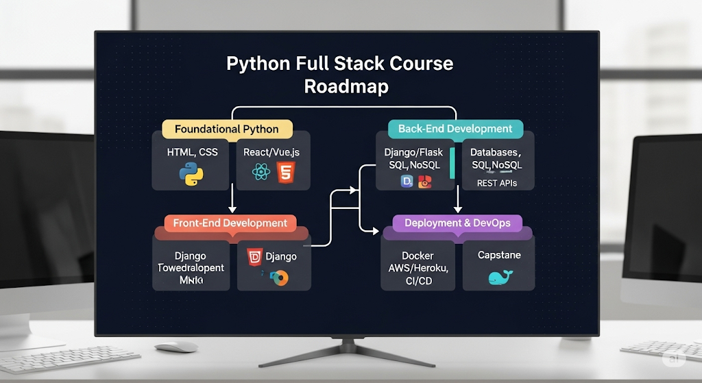 This Python Full Stack Development course enables you to build modern, full-featured web applications by combining front-end and back-end technologies. You’ll start from the basics of web design, progress into advanced Python and Django for server-side development, and finish with deployment techniques on cloud platforms. Real-time projects and interview preparation sessions are included, making this course ideal for students, job-seekers, and career-switchers.