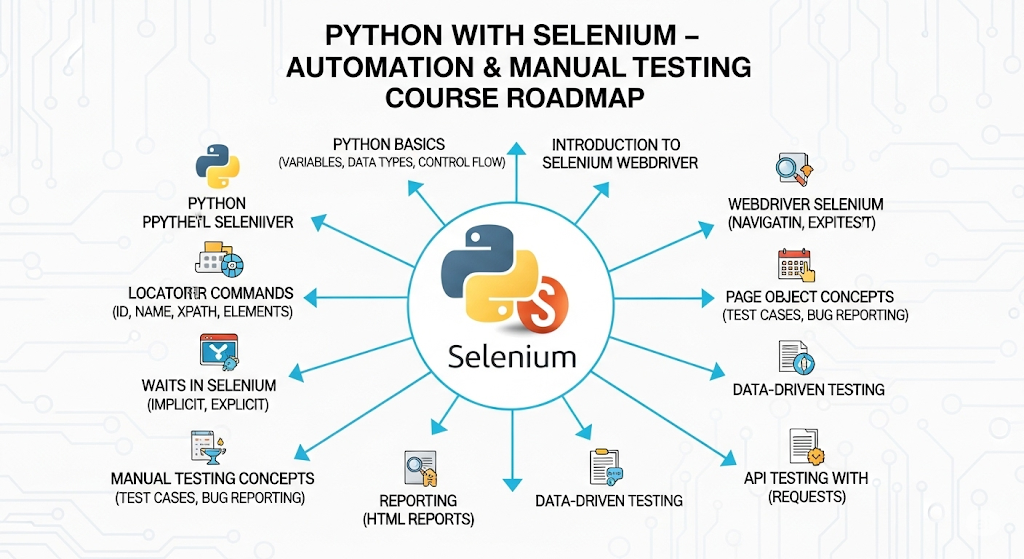 The Python Testing course is designed to provide comprehensive training in automation testing using Python. It covers essential testing frameworks such as PyTest, Selenium with Python, BDD using Behave, and automation tools like Jenkins and Git. Ideal for freshers, manual testers, or professionals transitioning into automation with Python to become QA Automation Engineers.
